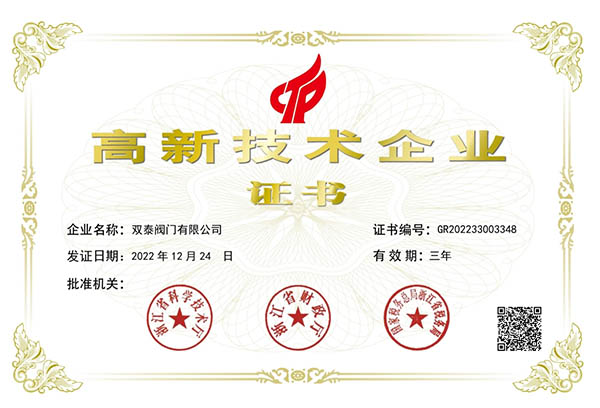雙泰閥門榮獲:浙江省高新技術企業(yè)